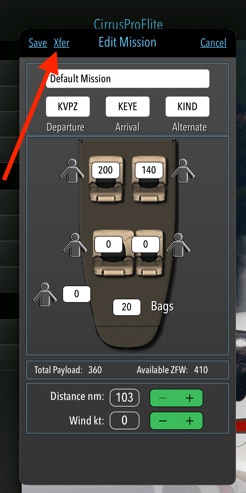 When touching the “Xfer” button, the airports will be loaded into the Route page and the payload configuration (passenger/baggage weights) will be loaded into the Weight & Balance page.