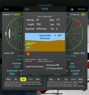 2. Departure runway profile. The runway elevation is taken in 500' increments. Runway gradients are an AVERAGE from the total elevation difference divided by the runway length. Gradients are “optionally” applied only in worst case scenarios. In other words, if the departure runway is uphill, the takeoff distance will be lengthened accordingly. If the runway is downhill, no advantage is calculated.