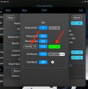2. Fuel Adj: %. This is based on your experience as to actual fuel usage. After a few flights, compare the Total Req’d to the actual fuel used, then set this % to match the actual fuel used. Touch the “Fuel Adj” button to reset.
