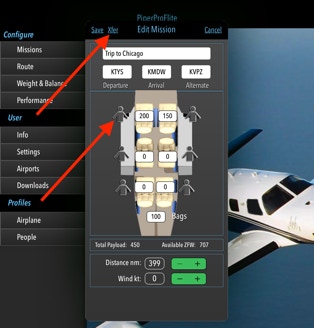 Missions are a handy way of setting up the Route page and the Weight & Balance page. If People have been added (See People), then touching the person icon will present a list of previously defined names and weights for quick entry.