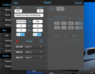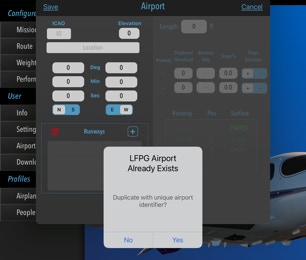 User Airports may be more useful to non-US app users as the Airport database is not updated as frequently as the US airports which are updated often by the FAA. However, this feature is sometimes useful in setting up “what-if” scenarios. The quickest way to set up an airport is to enter the ICAO code of an already existing airport. The app will inform you that the airport already exists. Touch “Yes” to duplicate the existing airport. A unique identifier will need to be entered into the ICAO textbox. Any four letter code can be used as long as it’s not already a defined Airport code.