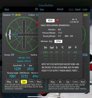 5. Latest METAR. This could be used, for example, upon arriving at the destination airport where the weather has changed significantly. Using the on-board WX, the METAR info can be changed manually to match the current weather. All performance data will be updated to reflect this change. All wind directions are TRUE