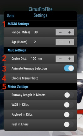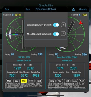 3. Animate Runway Selection. If “on” will spin the airplane around the available runways on the Performance Page when “Next” is selected.