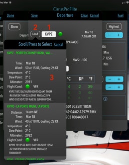 1. Departure and Arrival airport ICAO identifier. Touch for changing airport or viewing weather METAR.