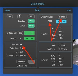 4. Cruise altitude can be manually entered using the +/- switch or by touching “Highest”. The highest optimal altitude will be entered based on direction of travel (East/West) and the minimum Cruise Distance as entered in Settings / Cruise Dist.