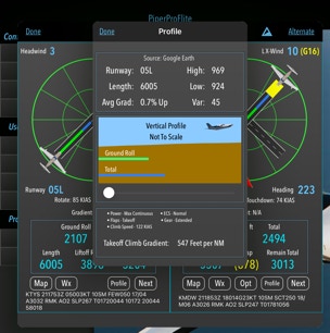 3. Show a Google Earth view of the current selected runway. Takeoff (Landing) Ground Roll and Total distances are shown. In the 3D view, only Total Distances are shown.
