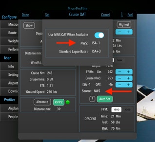 5 & 6. Set source for cruise temperature. The average ISA can be obtained automatically from the NWS. Temperature can also be entered manually, or the standard lapse rate can be used.