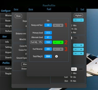 2. Fuel Adj: %. This is based on your experience as to actual fuel usage. After a few flights, compare the Total Req’d to the actual fuel used, then set this % to match the actual fuel used. Touch the “Fuel Adj” button to reset.