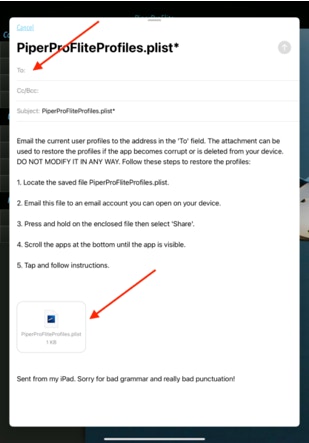 To restore profiles, simply email the file PiperProFliteProfiles.plist to an email address you can open on your device.