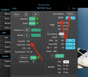 4. Cruise altitude can be manually entered using the +/- switch or by touching “Highest”. The highest optimal altitude will be entered based on direction of travel (East/West) and the minimum Cruise Distance as entered in Settings / Cruise Dist.